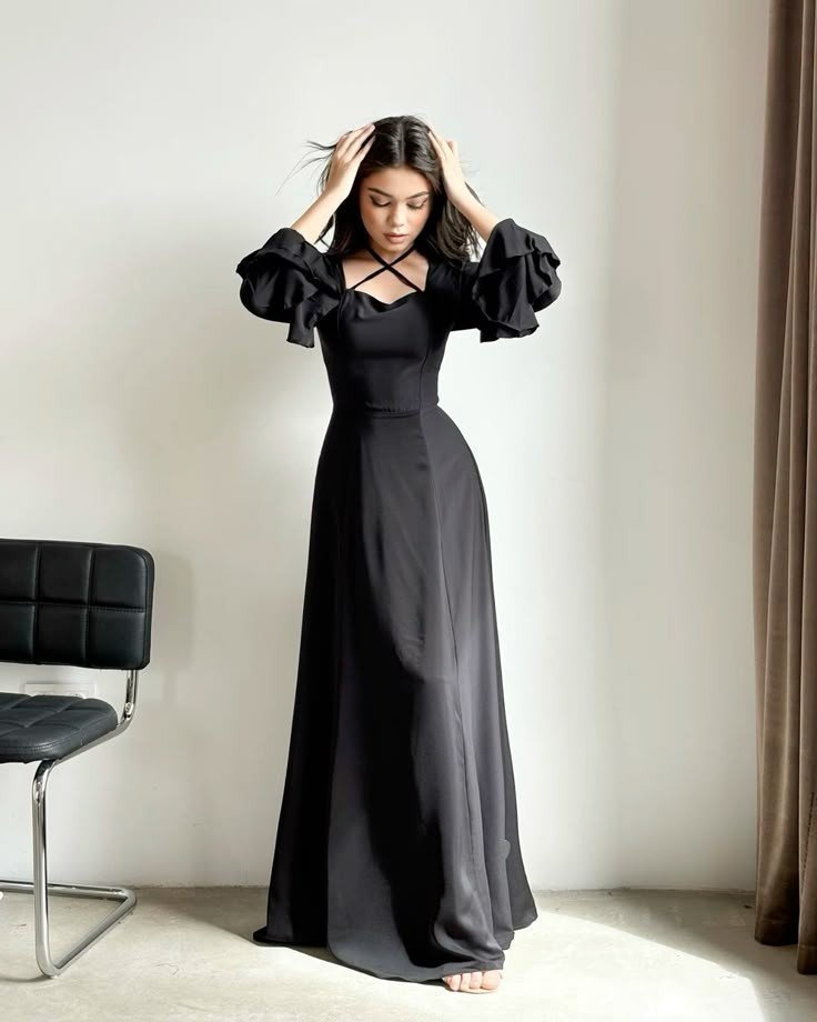This black maxi dress blends elegance with a bold twist. The long, sleek silhouette elongates the body, while the dramatic ruffled sleeves bring movement and personality. The unique neckline adds extra allure, creating a look that feels striking without trying too hard. It’s the perfect balance of sophisticated and statement-making for an unforgettable birthday night.