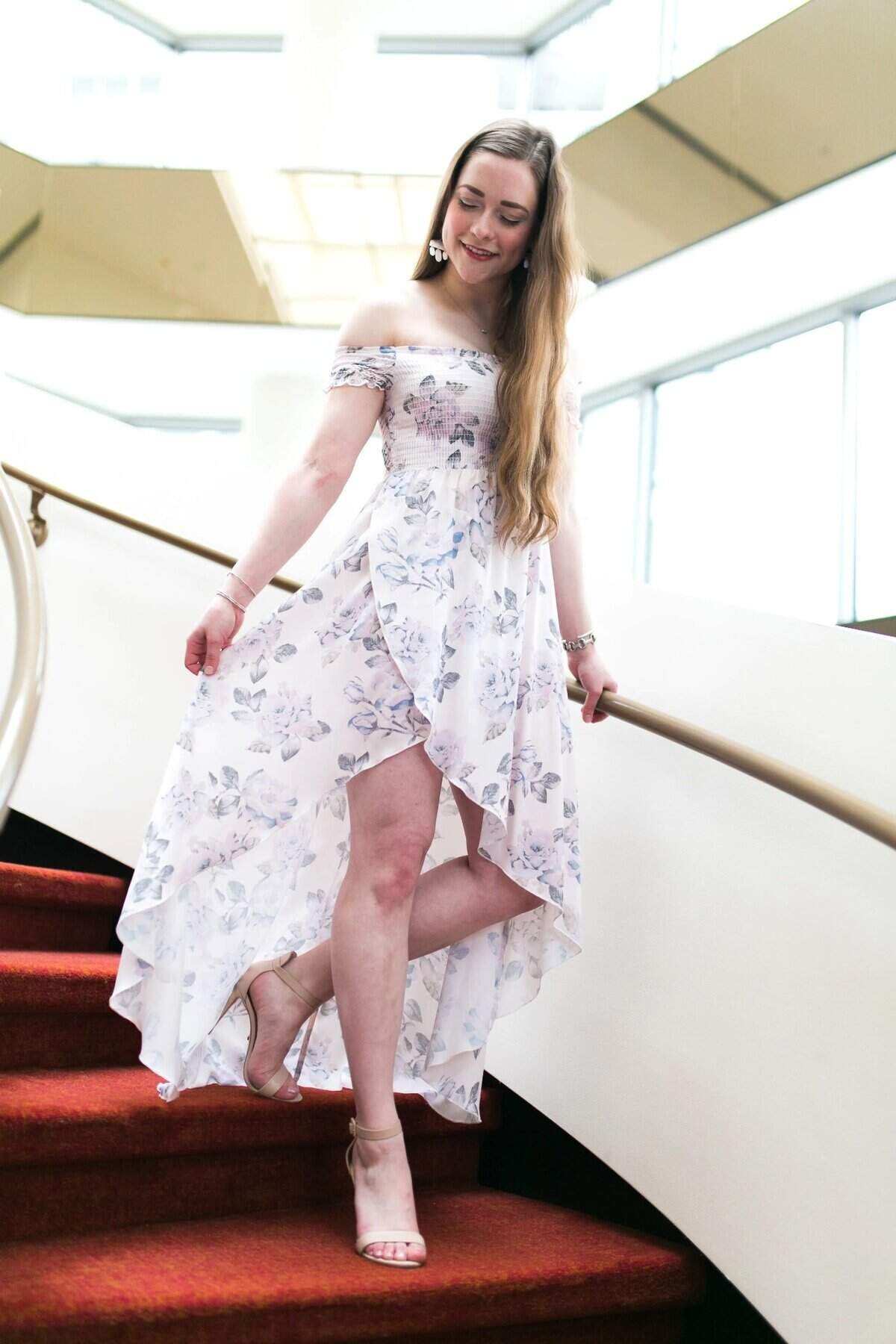 Soft florals and flowing fabric make this dress feel dreamy and celebratory. The off-shoulder neckline highlights your collarbones, while the high-low hem gives graceful movement as you walk.