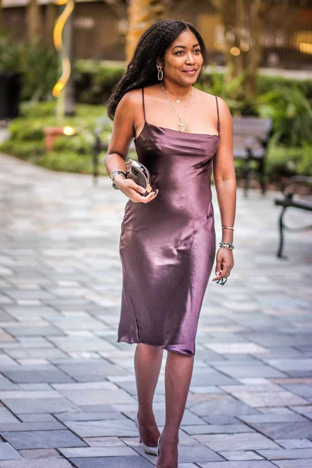 A satin slip dress always feels special. The silky fabric drapes beautifully, creating a minimalist yet alluring silhouette. It’s timeless, elegant, and easy to accessorize for different dinner vibes.