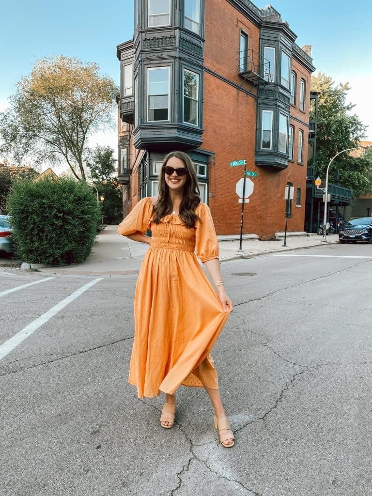 Bright, cheerful, and full of energy — this orange midi dress is pure celebration. Puff sleeves and a smocked bodice add charm, while the flowy skirt keeps movement light and fun.