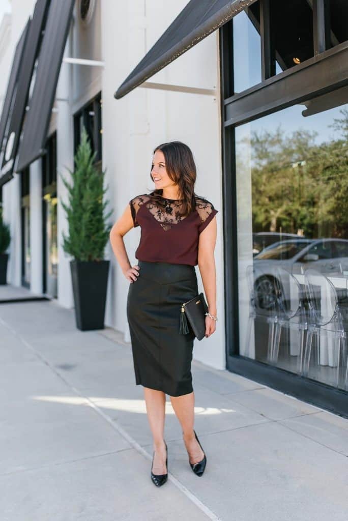 Deep burgundy paired with classic black creates a refined, flattering look. The lace detail adds a feminine touch, while the fitted skirt keeps it sleek and polished for professional celebrations.