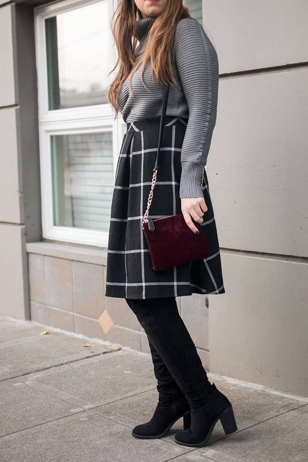 A cozy turtleneck and structured midi skirt bring together comfort and sophistication. Paired with tall boots and elegant accessories, it creates a standout party-appropriate office look.