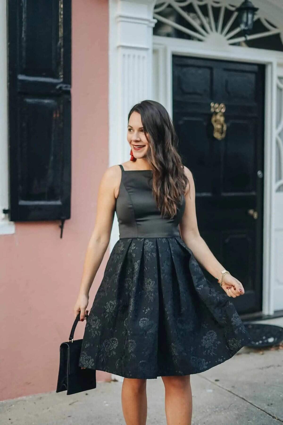 A flattering black dress with a playful flared shape creates a timeless party outfit. With bold accessories, it becomes polished, stylish, and celebration-ready.