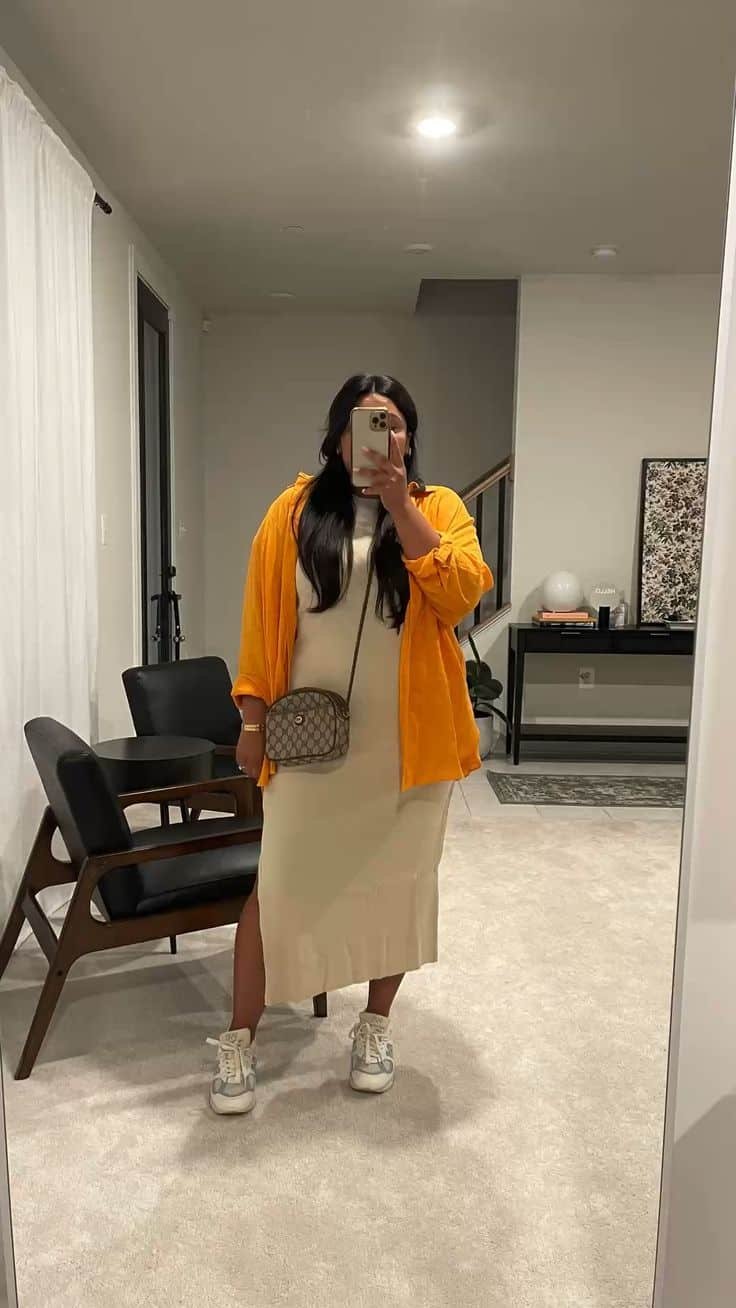 Layering takes center stage in this cheerful and practical outfit. A soft midi dress creates a smooth base, while an oversized button-down in a warm mustard tone adds personality and structure. Finished with sneakers and a crossbody bag, the look feels energetic, friendly, and ideal for teachers who move constantly throughout the day.