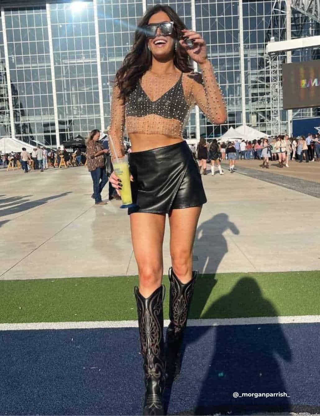 A rhinestone crop top instantly creates a glamorous concert look. Pairing a sparkling top with a sleek black leather mini skirt creates a bold and confident outfit that feels both edgy and stylish.