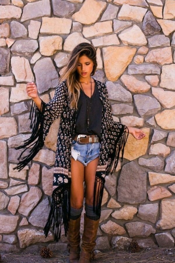 A fringed kimono with bold geometric patterns can easily transform a simple outfit into a statement look. Layer it over a black bodysuit and distressed denim shorts to keep the base outfit simple.