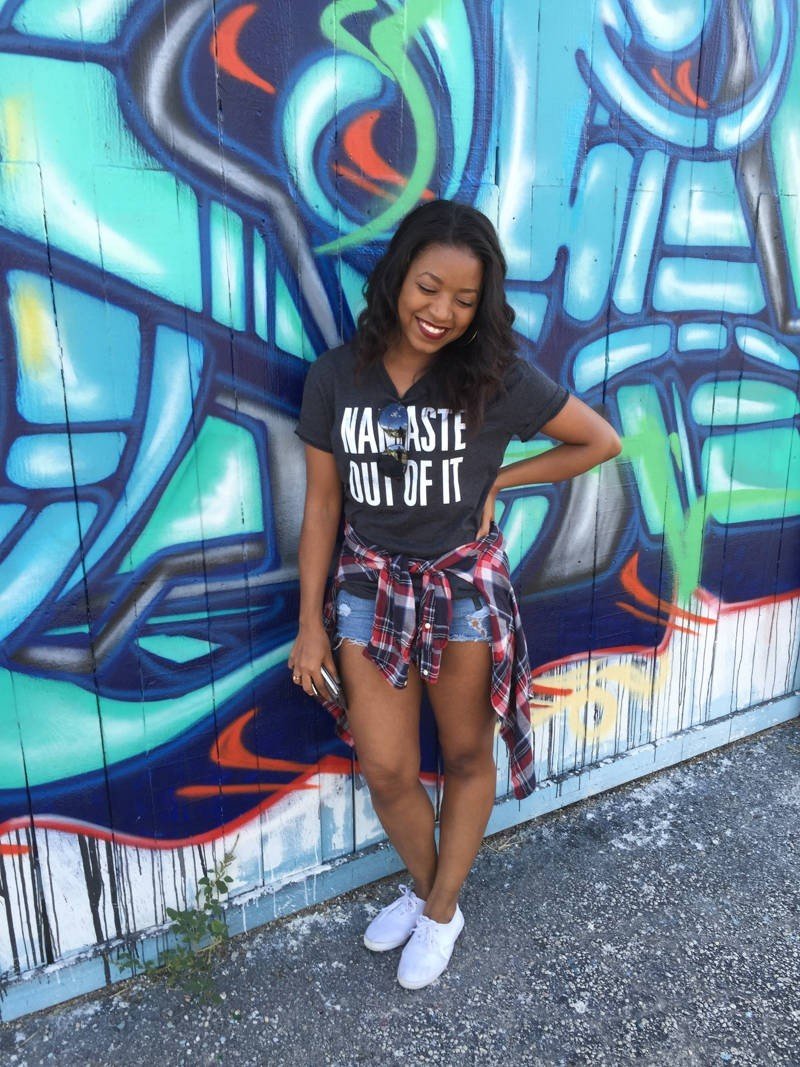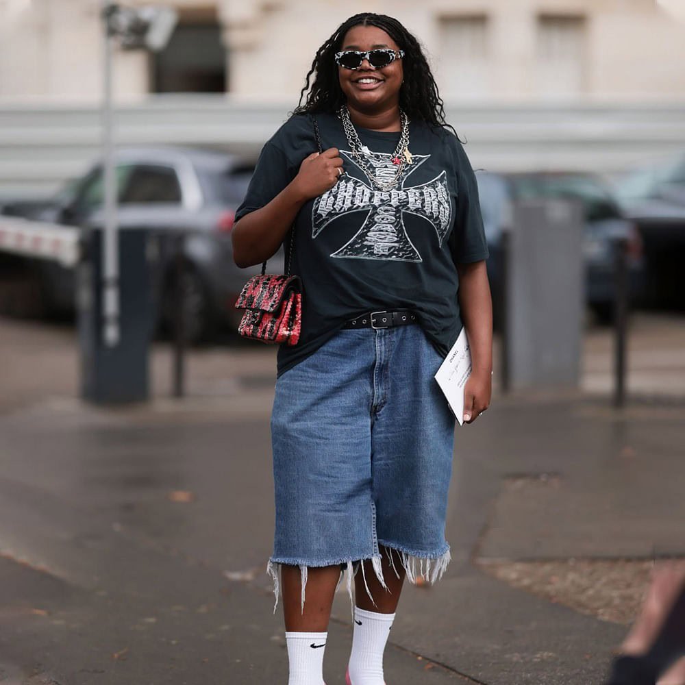 A graphic tee paired with a plaid shirt tied around the waist creates a relaxed look inspired by 1990s fashion.