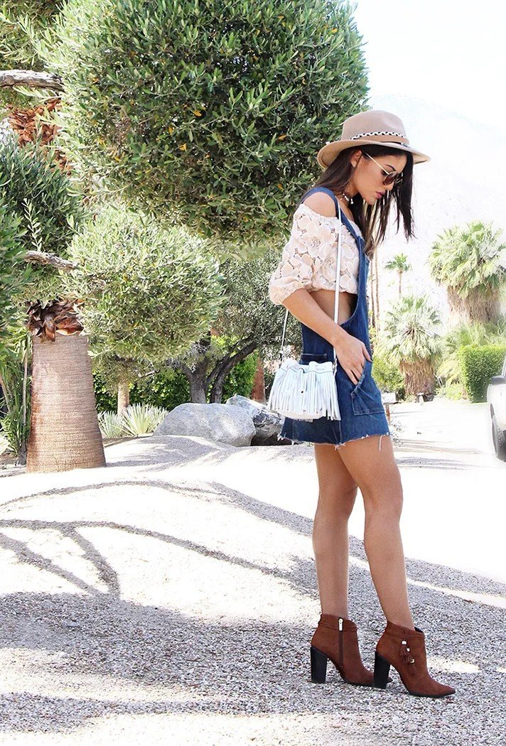 A fedora hat, boots, and a fringe crossbody bag complete the outfit with a classic festival-inspired style.