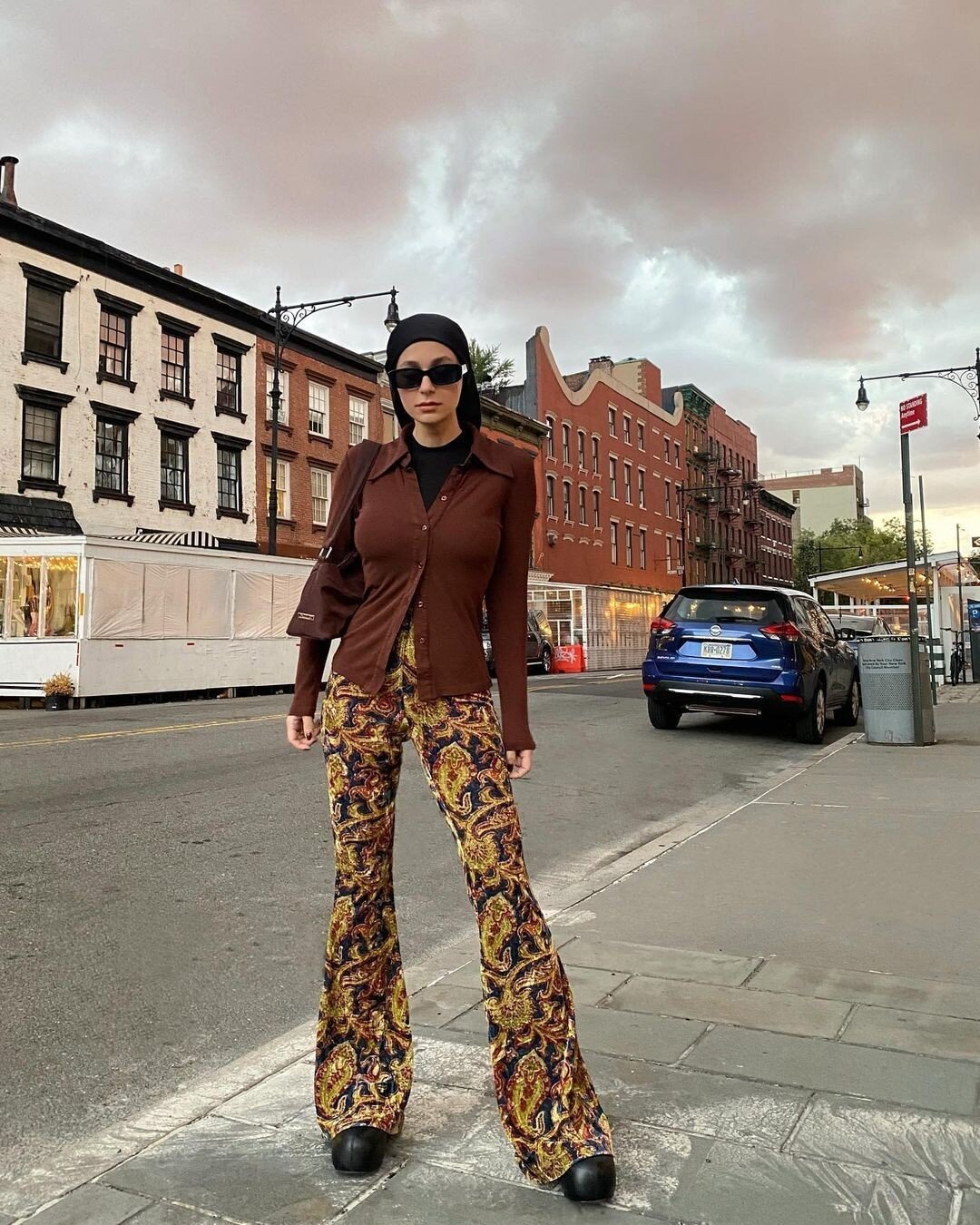 For a bold retro-inspired outfit, pair a burgundy button-up shirt with patterned flare pants.