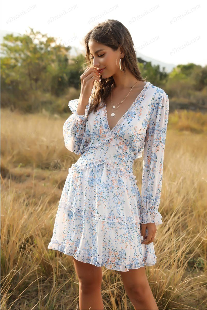 Prairie-style dresses are known for their soft prints and flowing silhouettes. A floral wrap mini with ruffled hems and lightweight fabric captures that countryside charm beautifully.