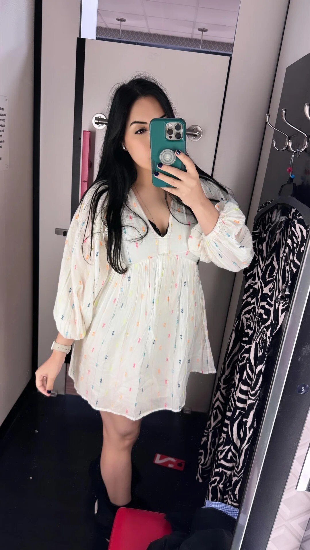 With its playful pattern and delicate design, this dress looks equally stylish with chunky loafers or strappy sandals. The overall effect feels charming, youthful, and perfectly suited for warm weather.