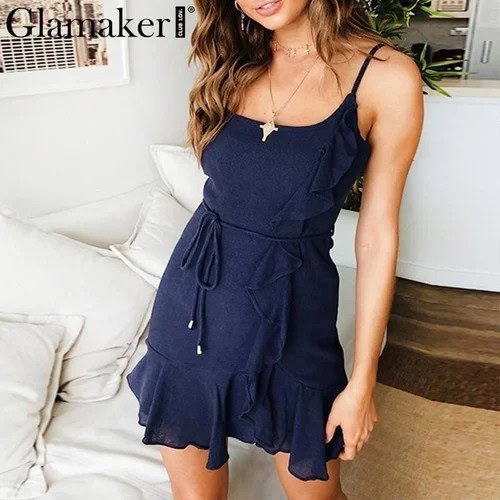 A navy mini dress with cascading ruffles adds movement and charm to an otherwise simple silhouette. The delicate straps and scoop neckline keep the design minimal while the ruffle details create visual interest.