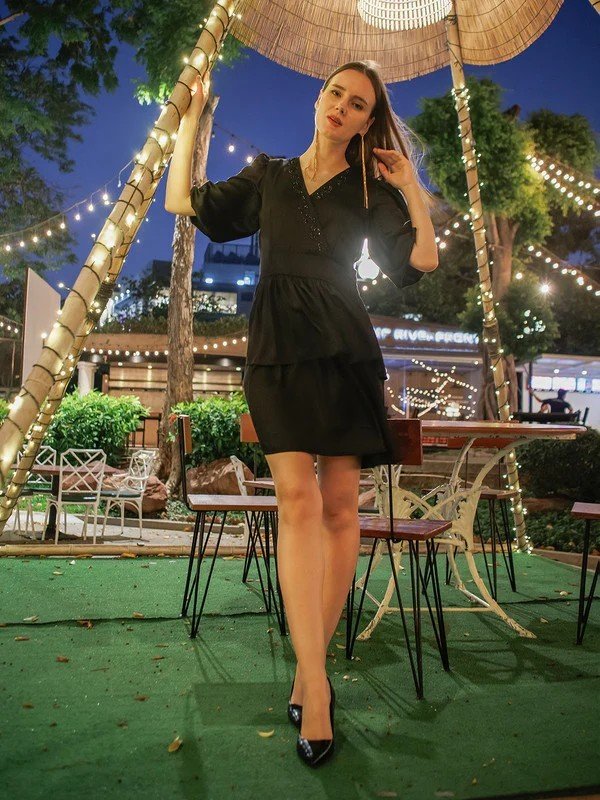 A black and white mini dress creates a striking yet balanced look. The contrast between the two shades highlights the design details while maintaining a clean and modern aesthetic.