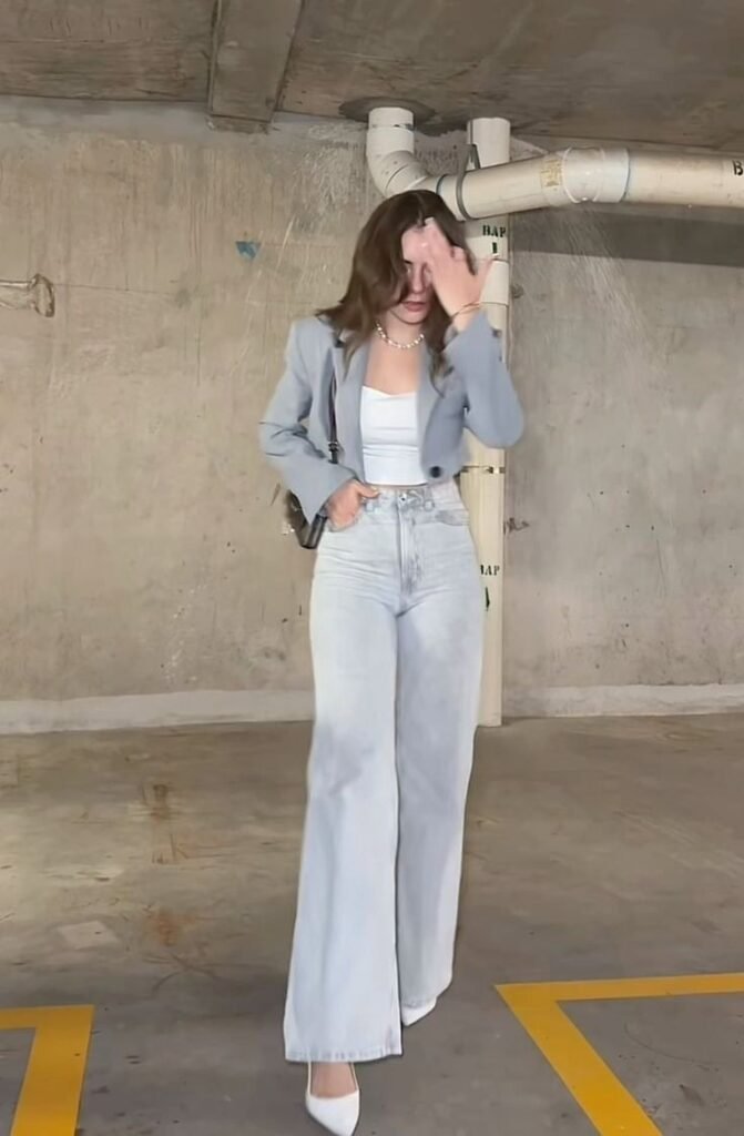This pairing shows how lighter pieces can still work for winter when styled well. The soft tank keeps things fresh, while wide-leg jeans bring comfort and structure. Added layers can adapt the look for colder days, keeping it stylish and practical.