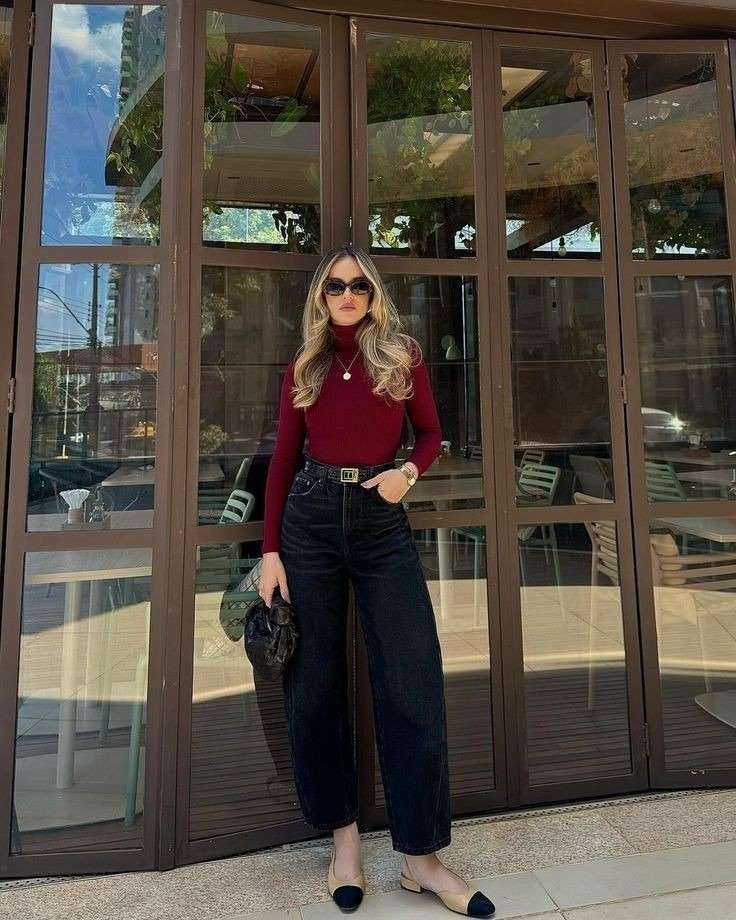 This look balances casual denim with a rich, stylish top. The deeper tone adds maturity and strength, while accessories complete the polished yet relaxed vibe. It’s simple but impactful, offering an easy option that still feels thought-through.
