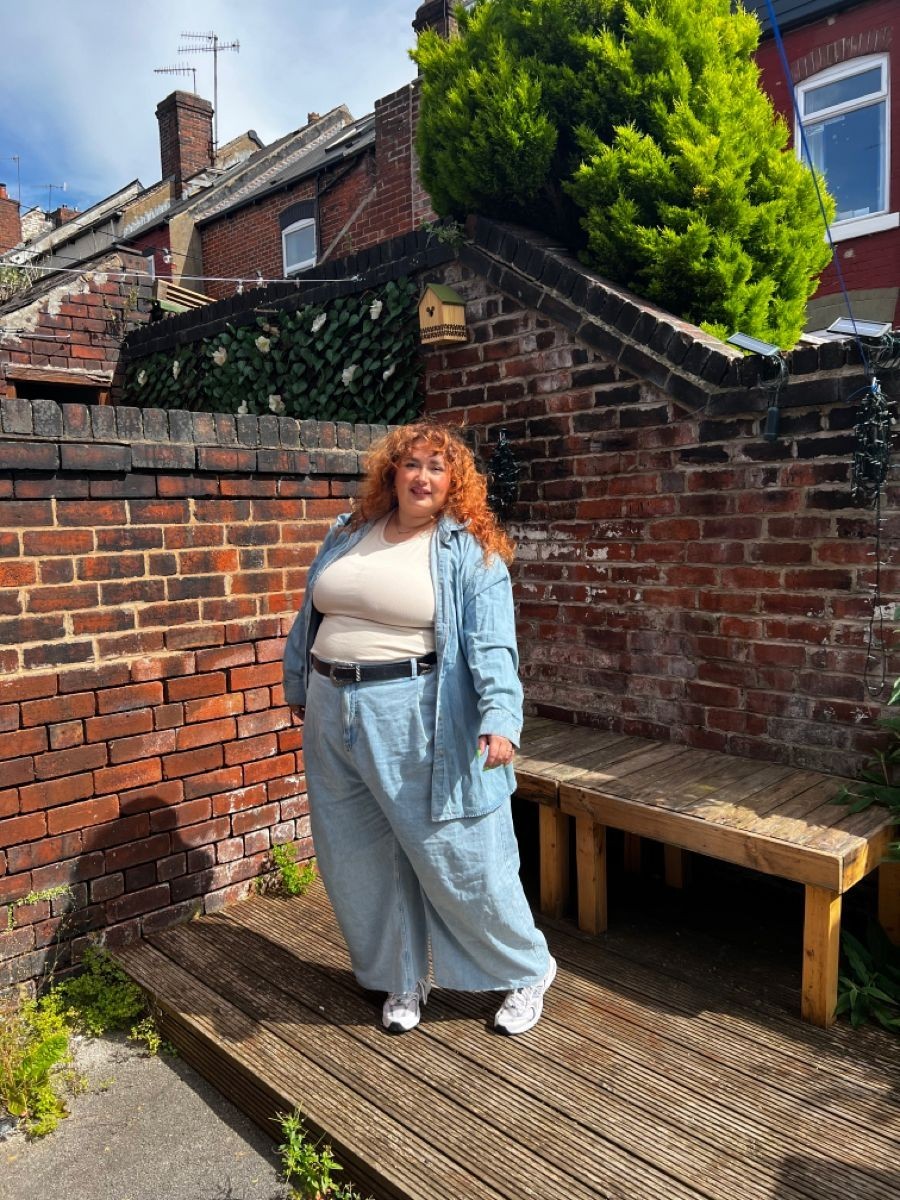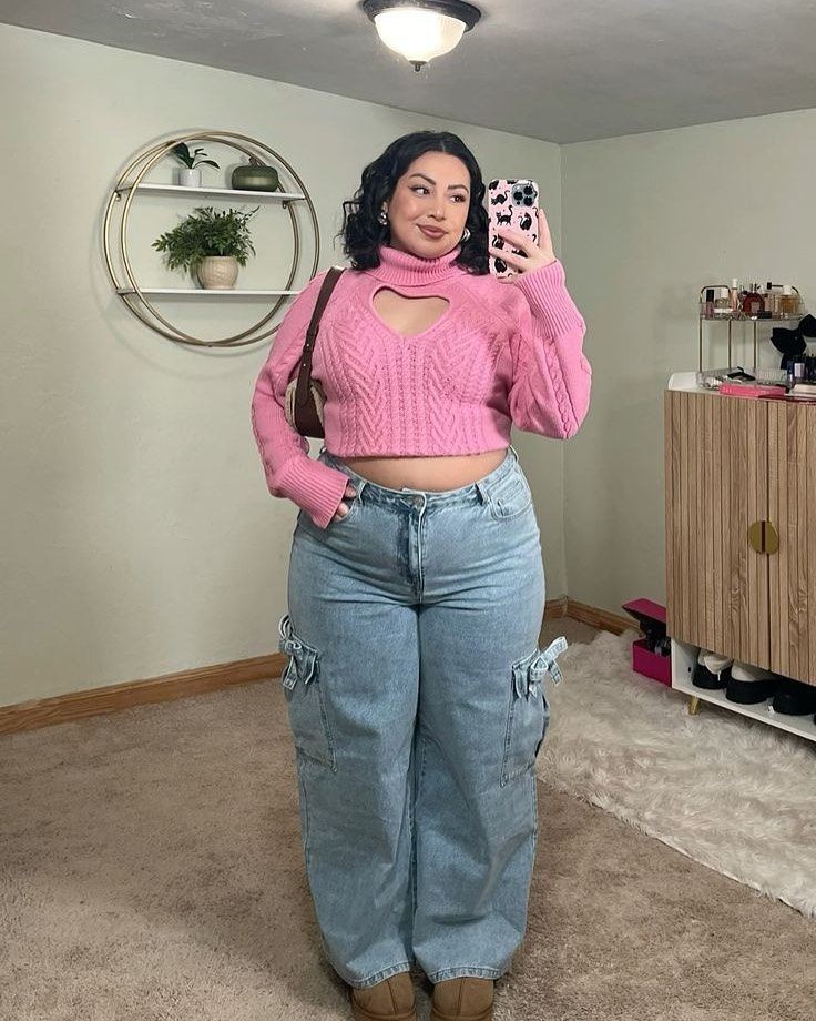 The heart-cutout pink cable-knit sweater brings a youthful, fun touch to a plus-size streetwear wardrobe. When teamed with high-waisted wide-leg jeans, it balances proportions and adds flow to the silhouette. The mix of textures—the softness of the knit against the structured denim—keeps the outfit interesting without feeling overdone. This combination works for casual hangouts, weekend errands, or brunch, showing that cropped tops and statement denim can look flattering and stylish on any body type.