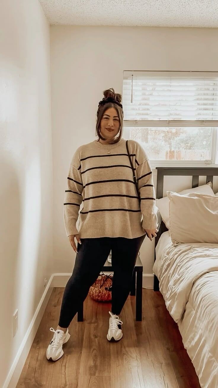 A horizontal striped sweater in neutral tones adds dimension to the outfit, while black leggings balance the proportions and maintain a streamlined silhouette. The oversized fit of the sweater creates comfort, and its ribbed texture adds depth and visual interest. White sneakers complete the casual street look. This outfit proves that timeless basics can be elevated into stylish streetwear when thoughtfully coordinated.