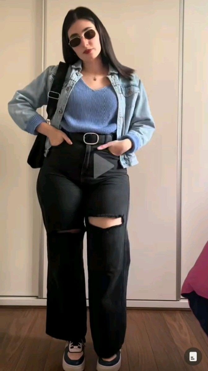 Distressed black jeans paired with a light-wash denim jacket create a timeless streetwear vibe with a modern edge. A fitted ribbed top underneath defines the figure, while a statement belt adds shape and polish. Ripped knees or subtle distressing add an extra touch of attitude, making the outfit feel contemporary and cool. Accessories like round sunglasses or crossbody bags enhance the street-ready energy. This look proves that edgy basics can be layered thoughtfully to create a flattering, attention-grabbing ensemble.