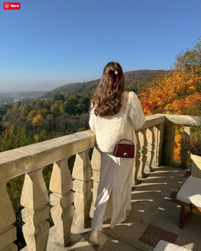 Flowing white trousers and a fluffy cream sweater create a delicate, dreamy ensemble. Finish with a burgundy ribbon in loose curls and a structured red bag for a soft, romantic touch.