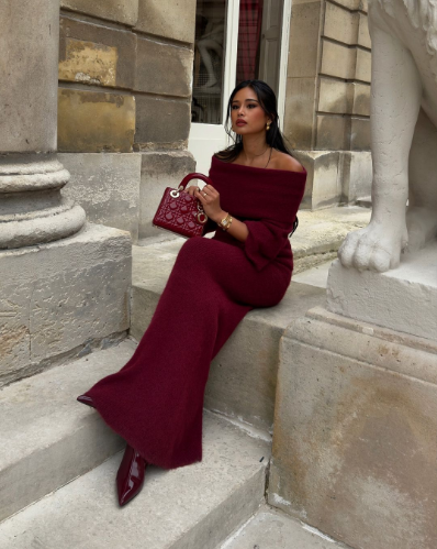 All-burgundy elegance! An off-shoulder knit dress with glossy pointed heels is cozy, polished, and perfect for Valentine’s dinner dates.