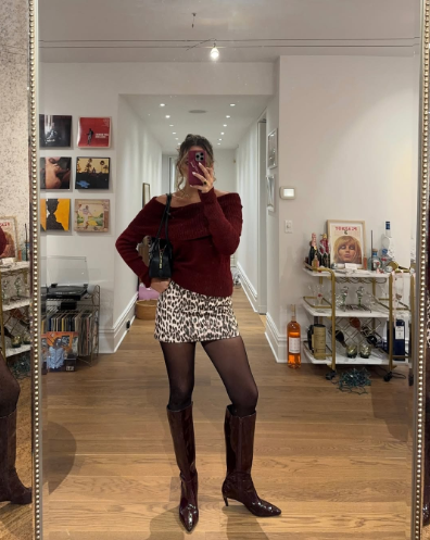 A burgundy off-shoulder sweater paired with a leopard mini skirt mixes soft romance with playful edge. Sheer tights and knee-high boots keep it sleek and bold.