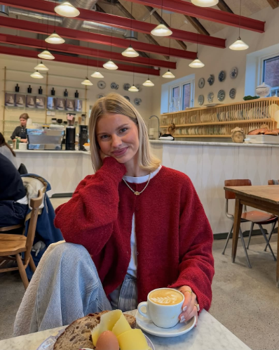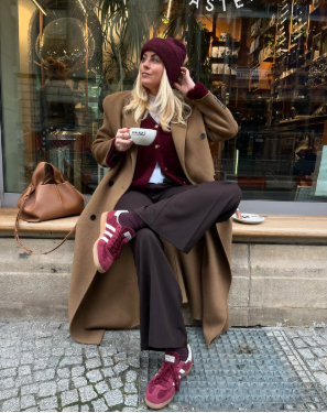 A timeless camel coat with a burgundy cardigan and beanie creates a cozy, polished Valentine’s outfit. Wide-leg trousers complete the sophisticated ensemble.