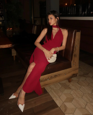 A deep red halter dress with a high slit is effortlessly romantic, finished with heart-accented white heels for playful, Valentine’s-ready style.