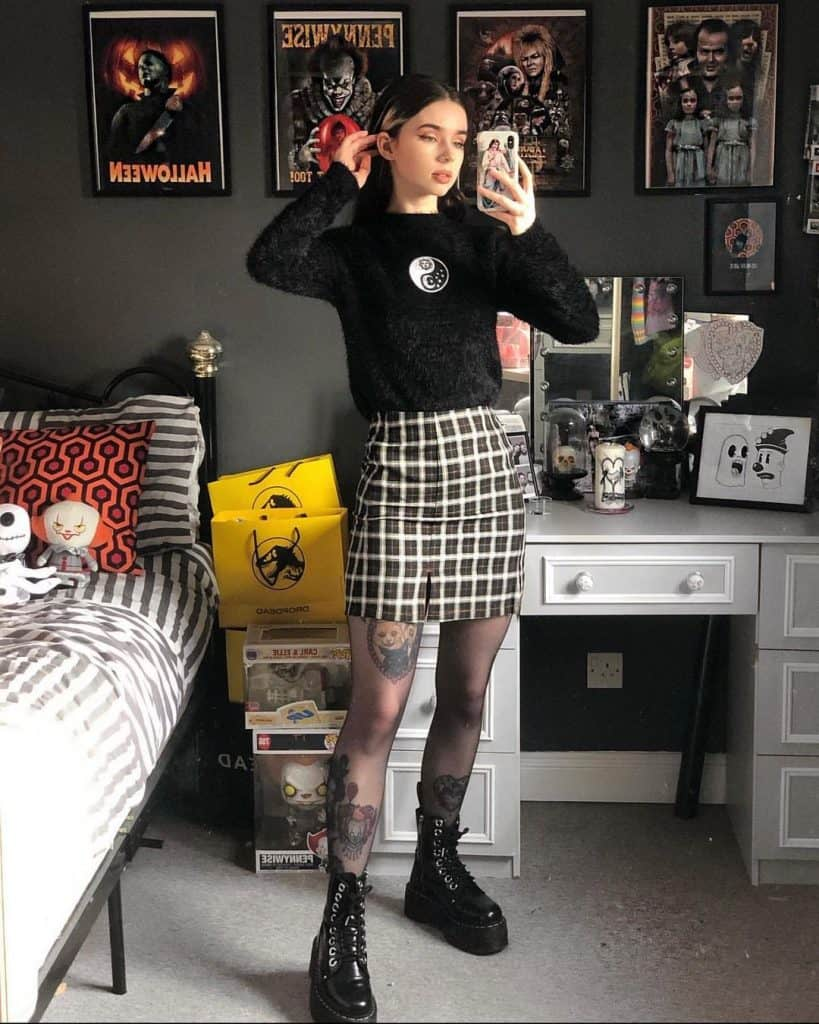 Plaid mini skirts are a grunge favorite. They give a 90s school vibe with an edge. Pair one with an oversized sweater.