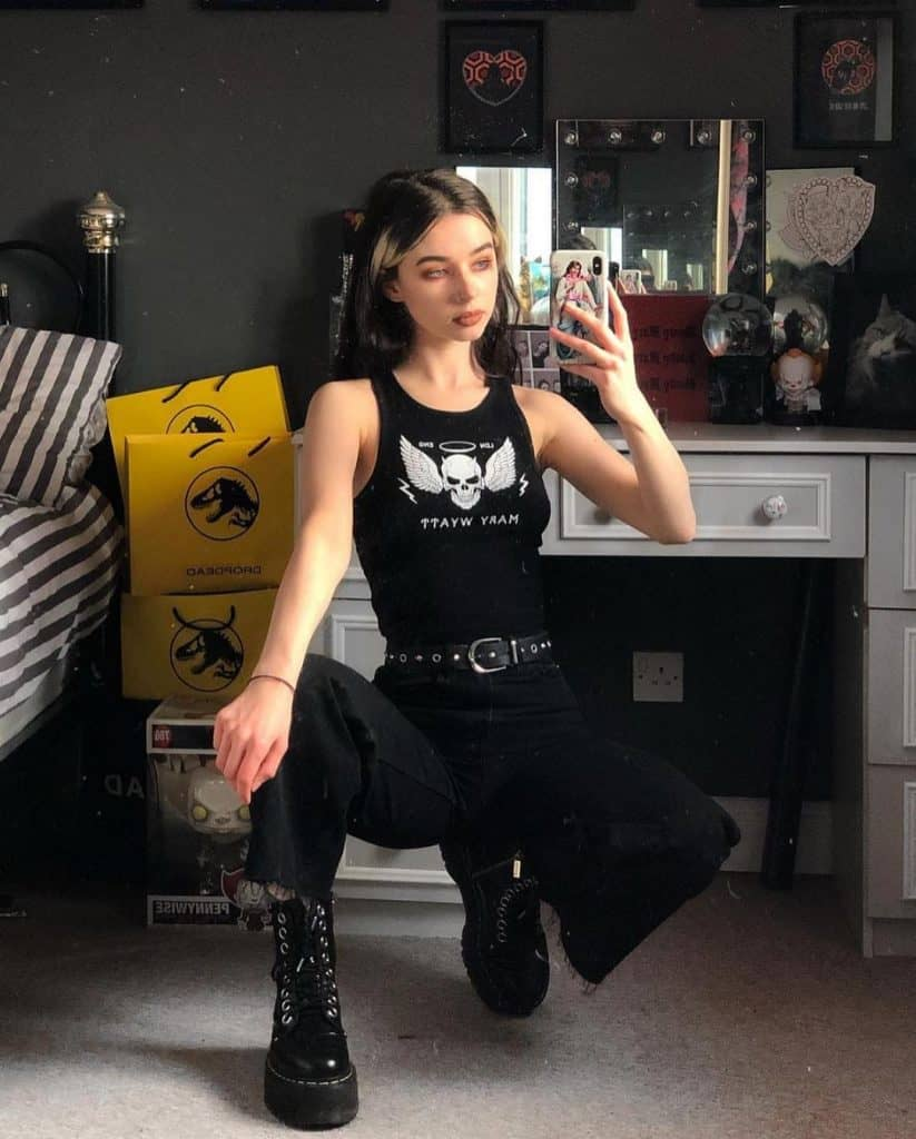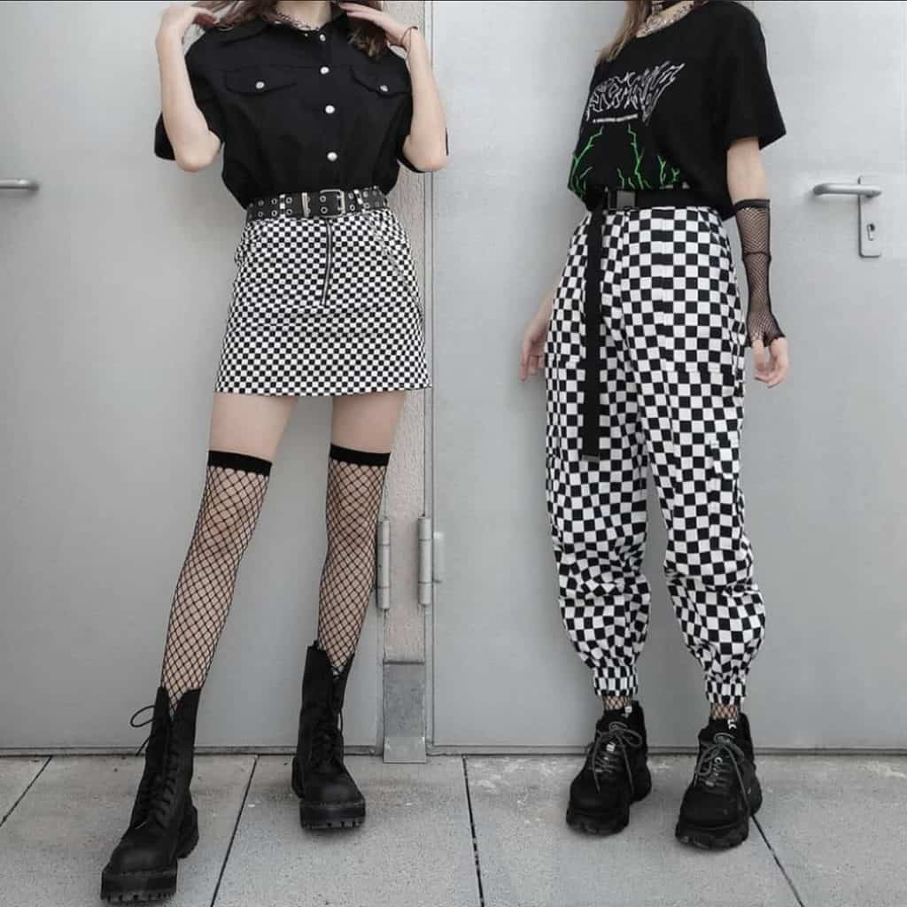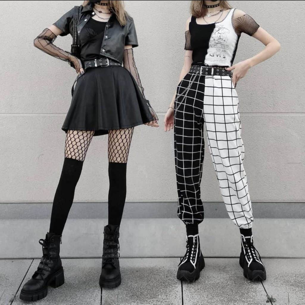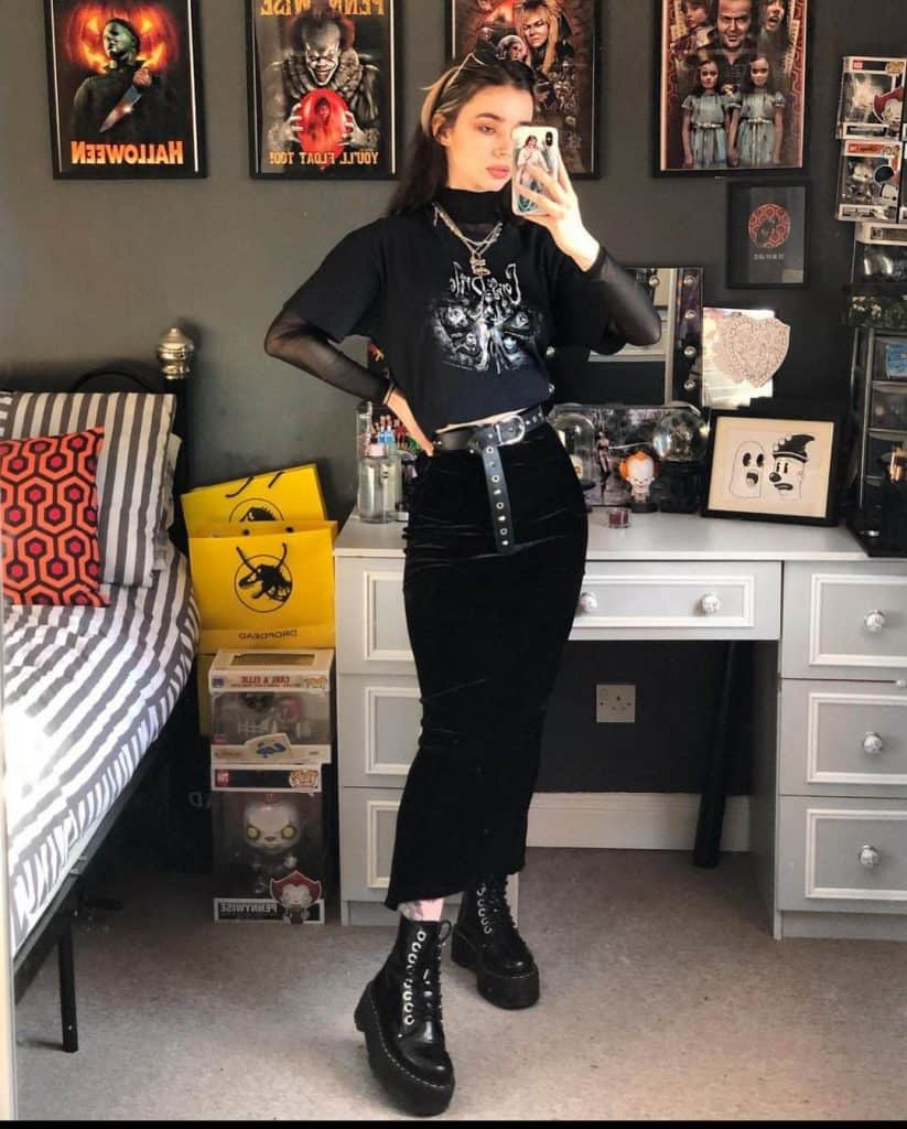 Platform sneakers, creepers, or Doc Martens are also great choices. The chunkier the shoe, the better it fits the style.
